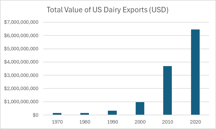 By the early 2000s, US dairy ingredients, including cheese, milk powders, whey protein, lactose, and isolates, were being incorporated into food manufacturing facilities across Saudi Arabia, the UAE, Egypt, Indonesia, and Malaysia. The upward trend in US dairy exports over the past five decades reflects the direct impact of these scientific and regulatory advancements.